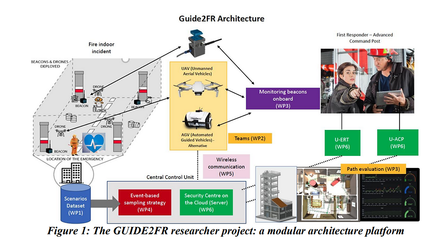 GUIDE2FR will provide support to Security, Prevention, Rescue, and Evacuation Services Indoors. This project will be based on Robot Swarm and Internet of Things (IoT) technologies capable of operating indoors with hostile conditions associated with an emergency. The robot swarm will be able to navigate autonomously and collect relevant information of the intervention (before and during it) in a distributed format from the environment, wearable devices of persons to be rescued, and wearable textile systems of rescue workers and firefighters. State of the art in emergency response mechanisms lags well behind the technological and scientific progress in manufacturing navigation devices, making decisions, and big data processes. We will introduce scientific contributions in mechanical and electronic modeling, acquisition and location modeling with BIM (Building Information Modeling), navigation modeling, and computational design. GUIDE2FR will facilitate autonomous monitoring and decision-making in realtime to avoid risks in emergency situations.